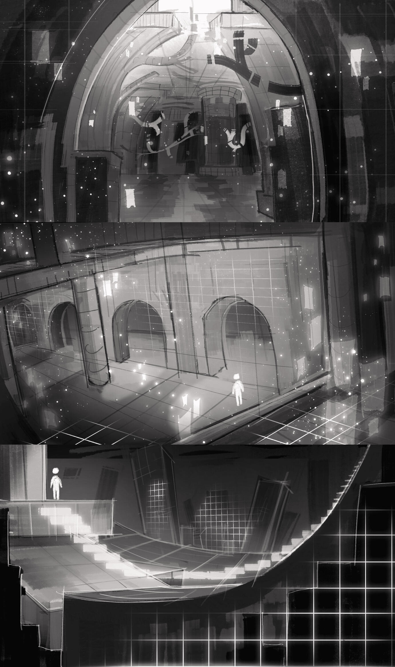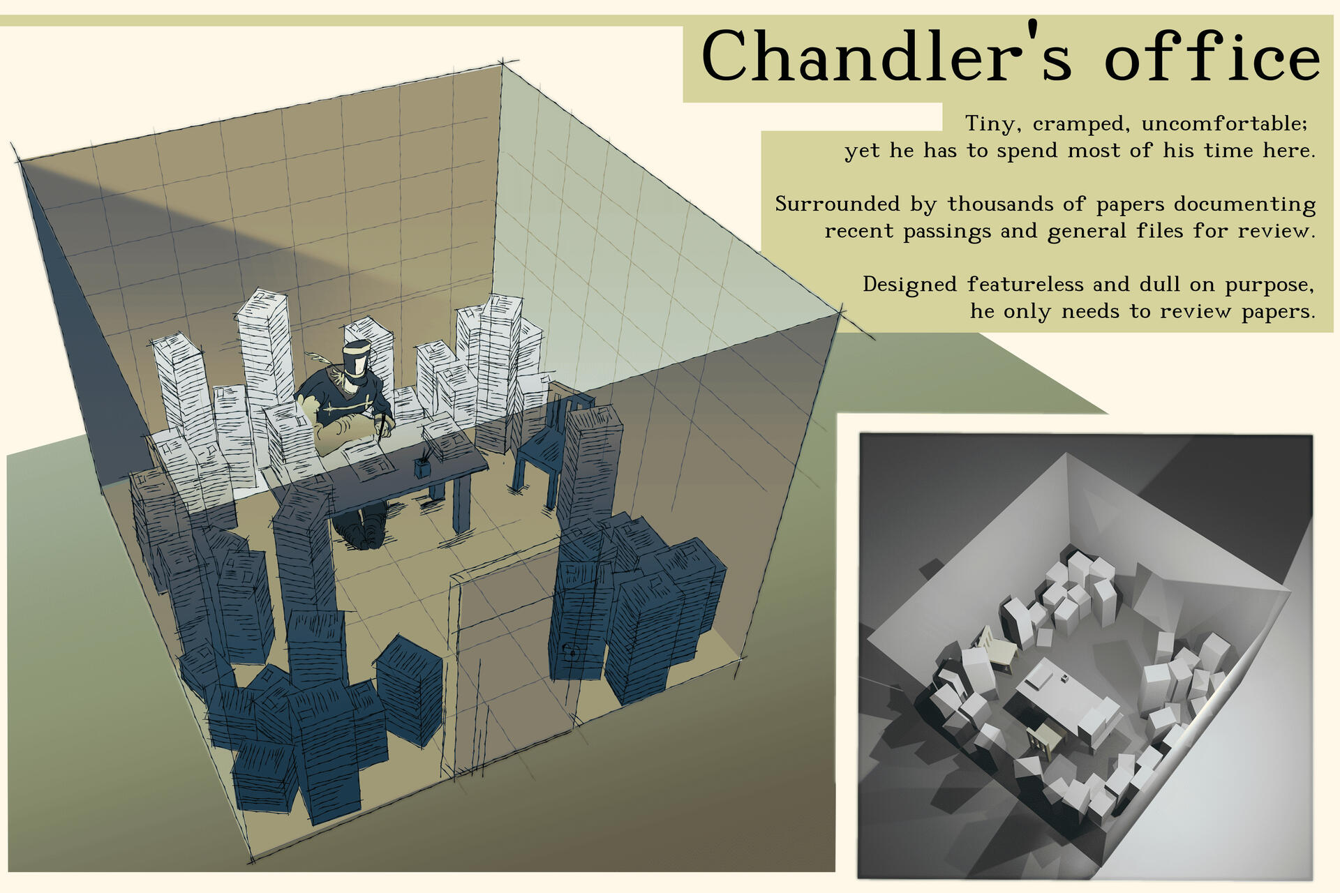 Limbo is for the most part barren and empty, its architecture consists of equally rather vague structures, however the detail of said structures can indicate its importance. For example: structures containing offices and regular workrooms will be simple and featureless, however rooms such as Moréna’s courtroom or higher-up meeting rooms can possess detailed patterns in forms of chessboard or various square patterning. Doric and Ionic types of pillars are also quite common to be implemented in the architecture.There’s inspiration taken from architecture types of Brutalism, Maximalism, and a smidge of Art Nouveau for more detailed structures and patterns.Limbo’s representative design is its rectangle patterning along with shapes reminiscent of a cross, which are majorly scattered around its barren lands.Limbo is fueled by a soul’s arrival, the moment a document of a soul’s passing is created and successfully curated by a clerk, it is then safely stored into an archive room. Said archive room fulfills Limbo’s circle of life & death by feeding off of a mortal’s personal documentation.