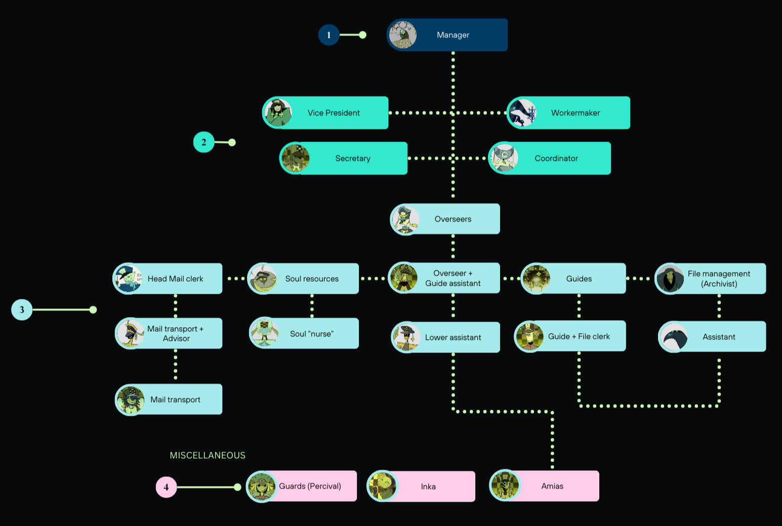 Workers on lower tiers may be restricted to classified information and vice versa.Overseers are mostly the all rounders, supervising workers in all sorts of departments and reporting back to their higher ups.Guides work with human souls specifically, assisting when needed so they may cross the border to Afterlife, they sometimes also interject with Archivists for potential documentation of a mortal’s information.Mail handlers manage and deliver all incoming and outcoming letters of Limbo.