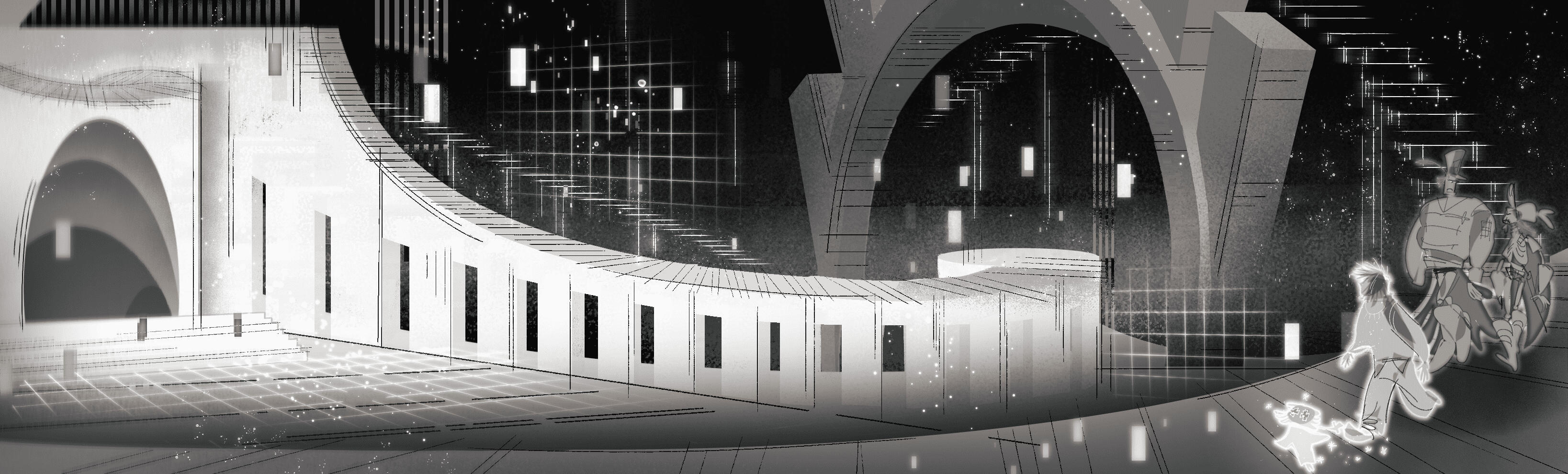 Limbo is for the most part barren and empty, its architecture consists of equally rather vague structures, however the detail of said structures can indicate its importance. For example: structures containing offices and regular workrooms will be simple and featureless, however rooms such as Moréna’s courtroom or higher-up meeting rooms can possess detailed patterns in forms of chessboard or various square patterning. Doric and Ionic types of pillars are also quite common to be implemented in the architecture.There’s inspiration taken from architecture types of Brutalism, Maximalism, and a smidge of Art Nouveau for more detailed structures and patterns.Limbo’s representative design is its rectangle patterning along with shapes reminiscent of a cross, which are majorly scattered around its barren lands.Limbo is fueled by a soul’s arrival, the moment a document of a soul’s passing is created and successfully curated by a clerk, it is then safely stored into an archive room. Said archive room fulfills Limbo’s circle of life & death by feeding off of a mortal’s personal documentation.
